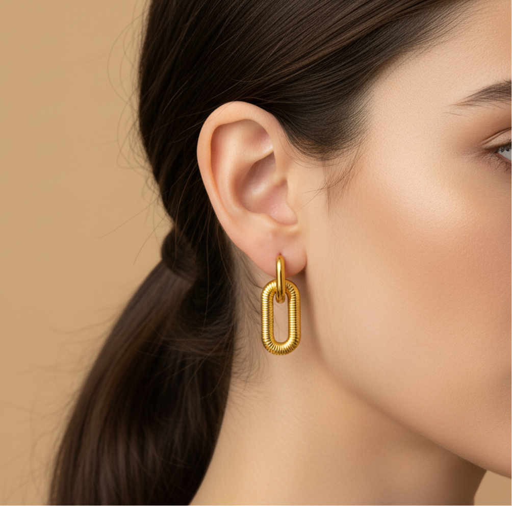 Two looks, one earring. These convertible hoops let you go from office to outing effortlessly — wear the smaller top hoop for your AM look or add the bottom hoop for a dressed-up PM vibe. Product Details: Material: Premium stainless steel (anti-tarnish, waterproof & sweatproof) Color: Gold Design: Dual-hoop detachable style Top hoop diameter: 1.5 cm Total length: 3.5 cm Weight: 15 g Note: Not recommended if your earlobe length from your piercing is more than 1cm.