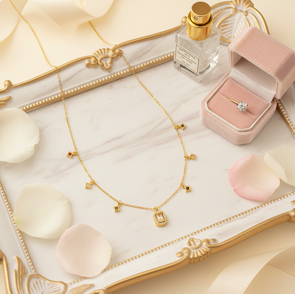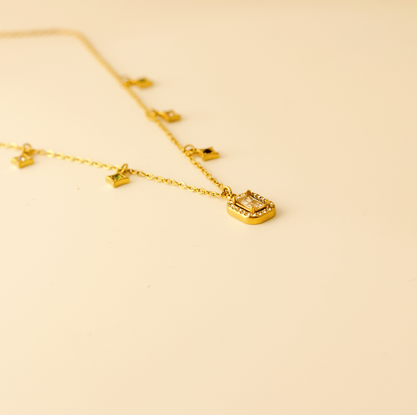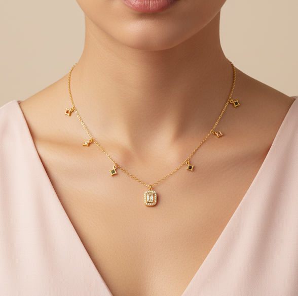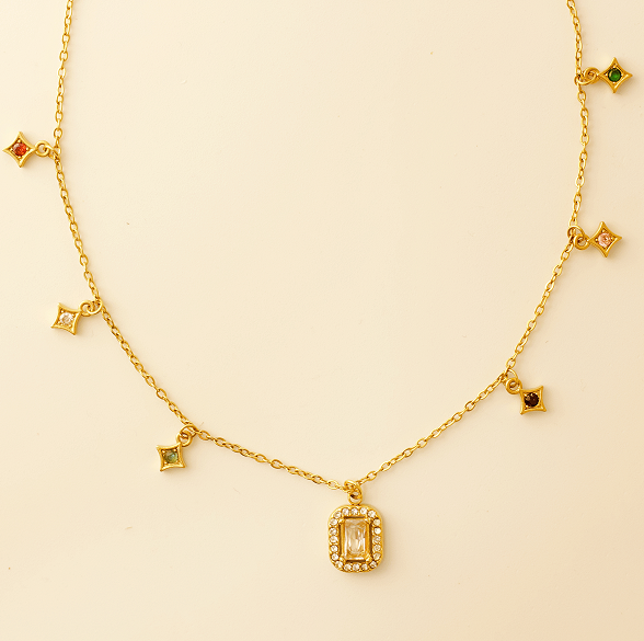 Vibrant and full of character, the Gold Everan Multicolor Charm Necklace brings color and sparkle to every look. A stunning white rectangular pendant shines at the center, flanked by six diamond-shaped charms featuring multicolored stones. It’s youthful, lively, and perfect for those who love a touch of color with their gold.