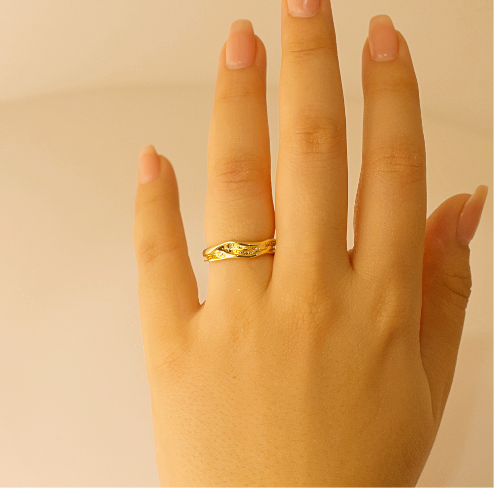 Simple, chic, and made to vibe with everything. This wavy gold adjustable band ring is a modern twist on the classic band — featuring subtle wavy engravings that catch the light just right. Product Details: Material: Stainless steel (anti-tarnish & waterproof) Adjustable fit for all finger sizes Band width: 0.4 cm